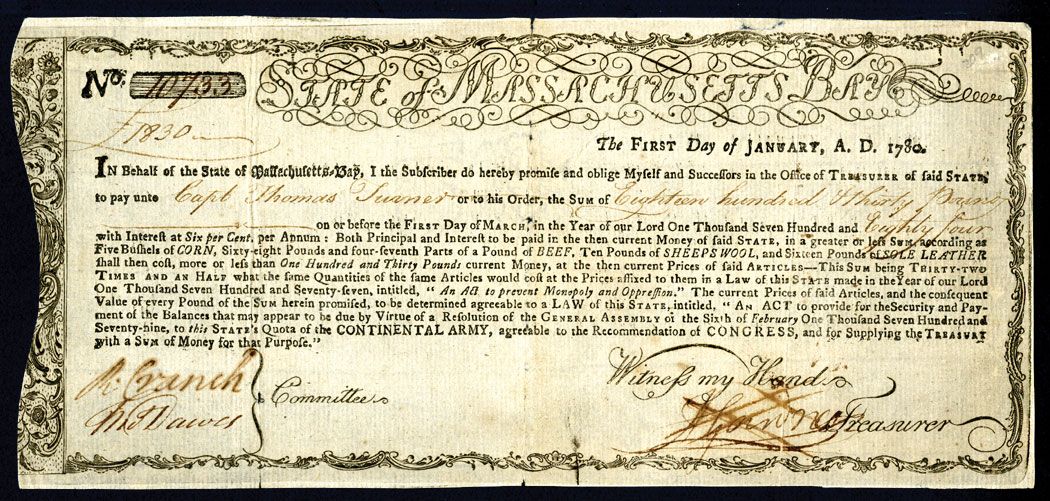 Treasury bond, £ 1830, January 1, 1780, 6% due 1 March 1784, and likely the first derivative instrument, it is redeemable in various commodities, as beef, sheeps wool, sole leather, corn. MA 22 VF scarce.