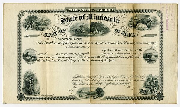 St. Paul, Minnesota. $-Odd Specimen Bond, Black print on black border with multiple vignettes covering certificate, POC's along bottom, Fine condition with toning at fold lines and splitting along lines as well, ABNC.