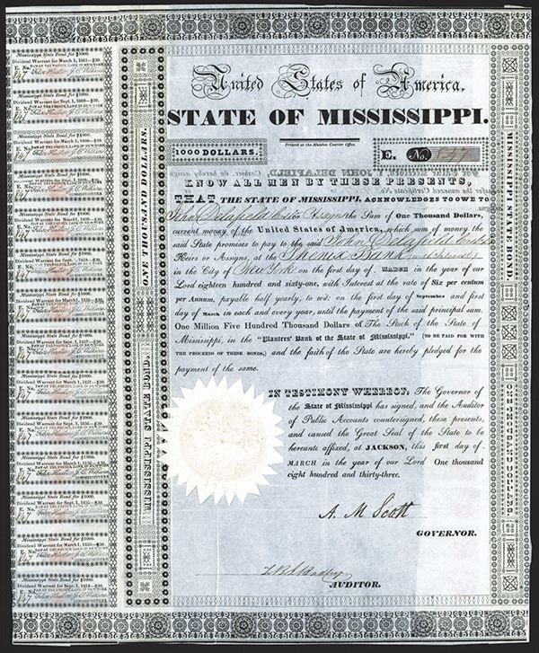 Mississippi, 1833, $1000, 6% Bond, Issued Bond, Black on black border and underprint, Coupons attached on sides, VF-XF condition, Natchez Courier Office.
