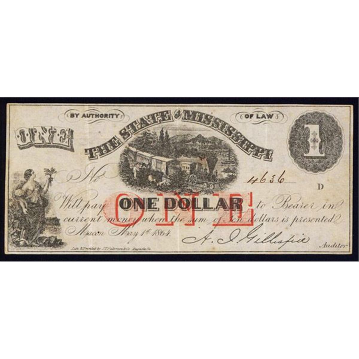 Macon, Mississippi, $1, P-S1397, Issued, Black with red protector ONE, Maid on left with train with people in middle, S/N 4636, Plate D, Paterson imprint, Crisp Choice VF to XF with 3 light vertical folds,