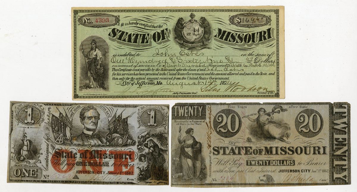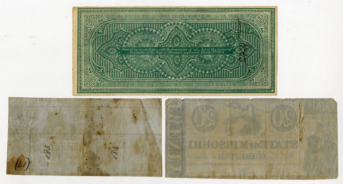 Jefferson, Missouri, 182-74. Lot of 3 Items, Includes: State of Missouri $1, P-Unlisted, Issued Banknote, S/N 62680, Fine to VF condition. A. Malus; $20 P-Unlisted, Issued Banknote, S/N 3384, Fine to VF condition. A. Malus; State of Missouri $169.49 I/U Check, S/N 4393, Printed by R.P. Studler Co. (3). Sold "AS IS" no returns accepted.