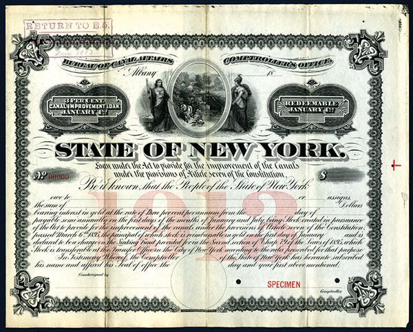 New York, Horizontal Specimen 3% Bond, Black border with canal image flanked by allegorical figures, POC's, VF condition, ABNC. Canal improvement loan.