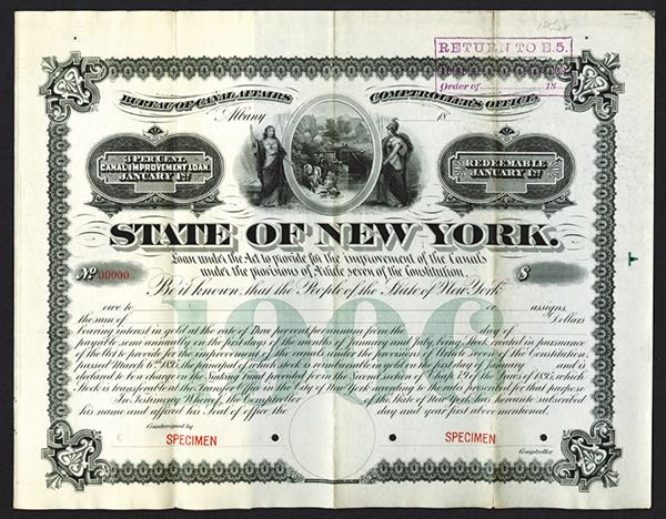 New York, Horizontal Specimen 3% Bond, Black border with canal image flanked by allegorical figures, POC's, VF condition, ABNC. Canal improvement loan.