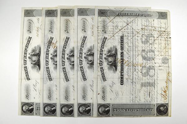 NY. Various amounts, 2000-15,000 Dollar Bonds. Cut Cancelled. Many with notations or endorsements on the backs. 5 pieces.