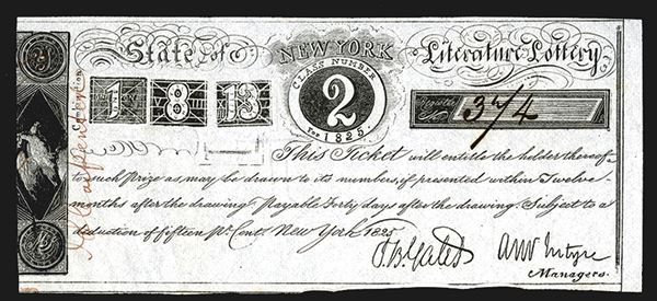 New York, NY, 1825, Issued lottery ticket, 6.3 x 2.75 inches, black without underprint, Lottery # 1-8-13, S/N 374, eagle on left, Class #2, payable 40 days after the drawing. AU to Uncirculated condition. Scarce early New York City lottery ticket.