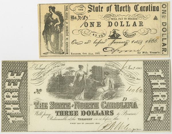 Raleigh, NC. Lot of 2 notes, Includes 1861, $1, Choice AU with a small nick in the top left corner ; 1863, $3, Issued, Uncirculated to Choice Uncirculated, attractive with nice margins. (2)