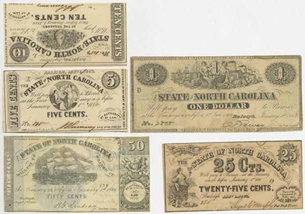 Raleigh, NC. Lot of 5 notes, Includes 1862, 10 cents, AU, mounting remnants; 50 cents (Printed on the back of a bond), VF to Choice VF; and $1, Fine; and 1863, 5 cents, AU, and 25 cents, Unc. with toning, mounting remnants, Attractive group of notes. (5)