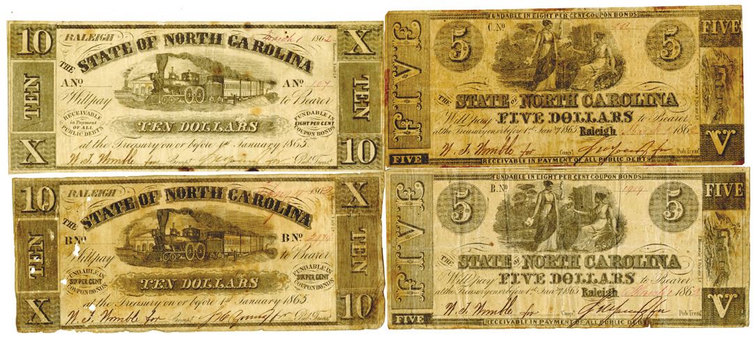 Raleigh, North Carolina.... Lot of 4 notes. Includes: Pair of March 1st, 1862, $5, CR. 86, Issued Obsolete Banknotes, S/N 1919 & 281, Both in Fine condition with small problems, stains or rust; Also includes Pair of $10 Issued Obsolete Banknotes: One February, 1862, CR, 82, S/N 2974VG with holes on left; and March 1st, 1862, CR. 84B, S/N 107, Very Good condition. (4)
