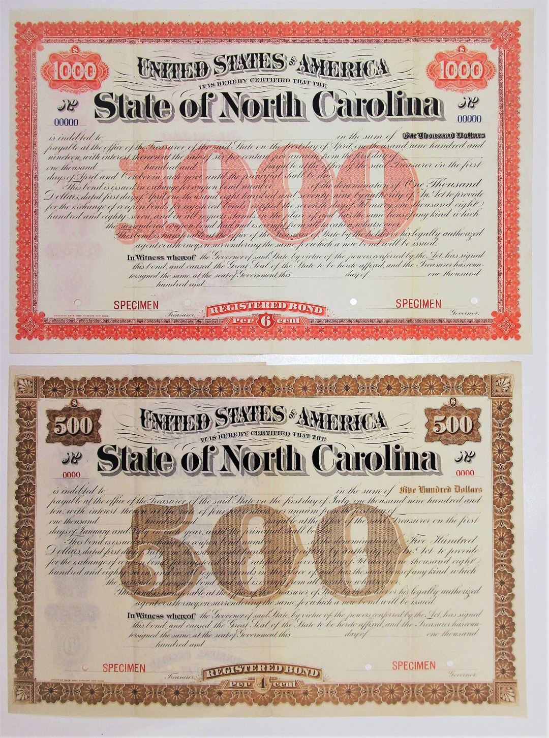 North Carolina, ND (ca.1880s). Lot of 2 Specimen Bonds, $500 and $1000 Specimen Registered Bonds, Both are VF-XF condition. ABNC. (2). Sold "AS IS" no returns accepted.