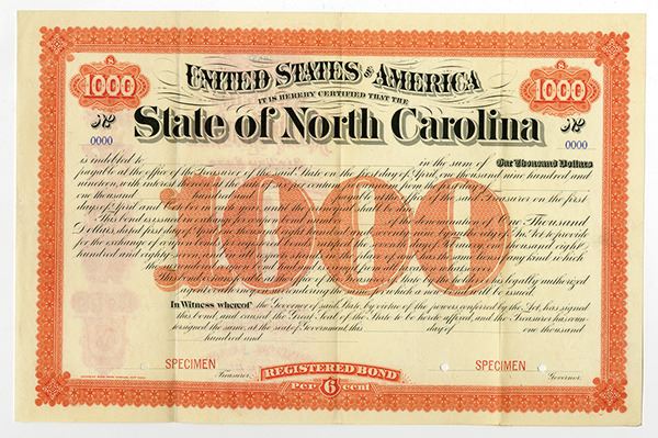 North Carolina. $1000 Specimen 6% Registered Bond, Black print on orange border and under tint, Company title at top, Specimen overprints and POC's, VF-XF condition, ABNC.
