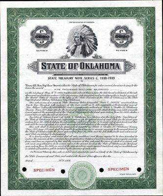 1938-1939. $1,000; $5,000. 5 different specimens. All are State Treasury Notes of different series and colors. All with Native American in full feather head dress. All different colors and series. Mostly all in choice condition. Rare group. SBNC.