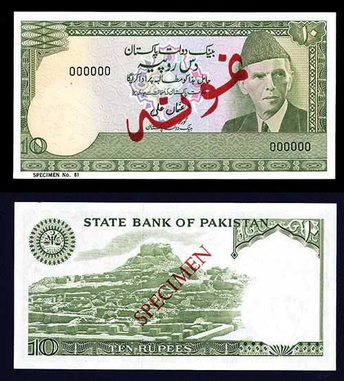 Pakistan, ND (1976-84), 10 Rupees, P-29 Specimen banknote, S/N 000000, Dark brown on m/c, “Specimen No.81” on lower left border, Specimen overprints, One light corner tip fold on the upper left keeps this Choice AU-Uncirculated note from CU.