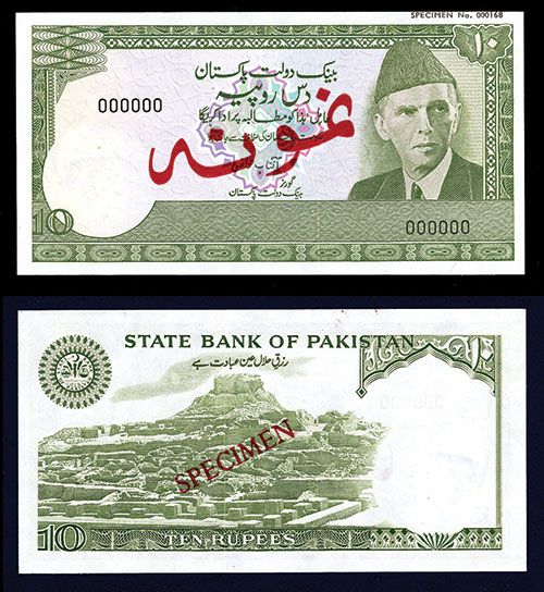 Pakistan, ND (1981-82), 10 Rupees, P-34 Specimen banknote, S/N 000000, Pale Olive-green on m/c, “Specimen No.000168” on top right border, Specimen overprints, Choice to Gem Uncirculated.
