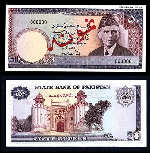 Pakistan, ND (1981-82), 50 Rupees, P-35 Specimen banknote, S/N 000000, Purple on m/c, “Specimen No.000168” on top right border, Specimen overprints, Choice to Gem Uncirculated.