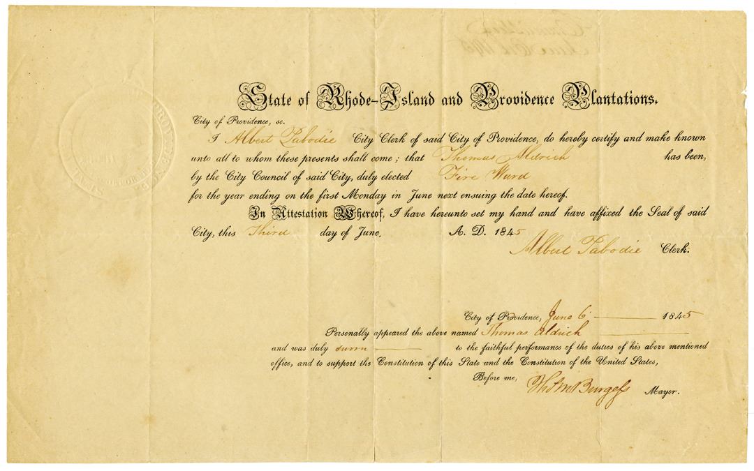 Providence, Rhode Island, 1845. Document from the City of Providence Clerk, Albert Pabodie, certifying that Thomas Aldrich "has been, by the City Council of said City, duly elected Fire Ward." Black text with dark brown handwriting, Embossed seal at top left, Signed by Providence Mayor Thomas Burgess. VF condition. Thomas Mackie Burgess (June 6, 1806 - October 17, 1856) was an American politician. He served as second mayor of Providence, Rhode Island from 1841 to 1852. He was mayor during the Dorr Rebellion (1841-42), a violent free-suffrage movement that promoted voting rights for all men regardless of property ownership. This was a turbulent time when Rhode Island had two separate governors vying to run the state concurrently. He also was president of the Providence, Warren and Bristol Railroad Co.