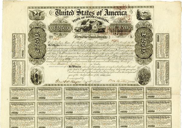 Columbia, SC., £250, I/C bond 5% coupon bond for the rebuilding of the City of Charleston, seated allegorical woman with SC arms in middle, Steamboat and dock scene UR, Phoenix rising from the ashes UL, Cotton plant LR and farmer LL, S/N 365, Normal folding from storage and multiple cut cancels that are difficult to view. Rare South Carolina bond. RW&H.