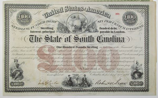 South Carolina, Lot of 2 pieces, Includes: 100 Pounds I/C 6% Sterling Funded Debt Coupon Bond in brown signed by Robert Scott; and, $1000 U/C 4.5% Bond in green. Both are in Fine condition. ABNC. (2)