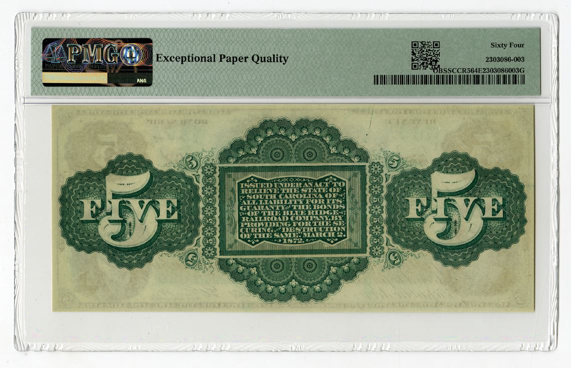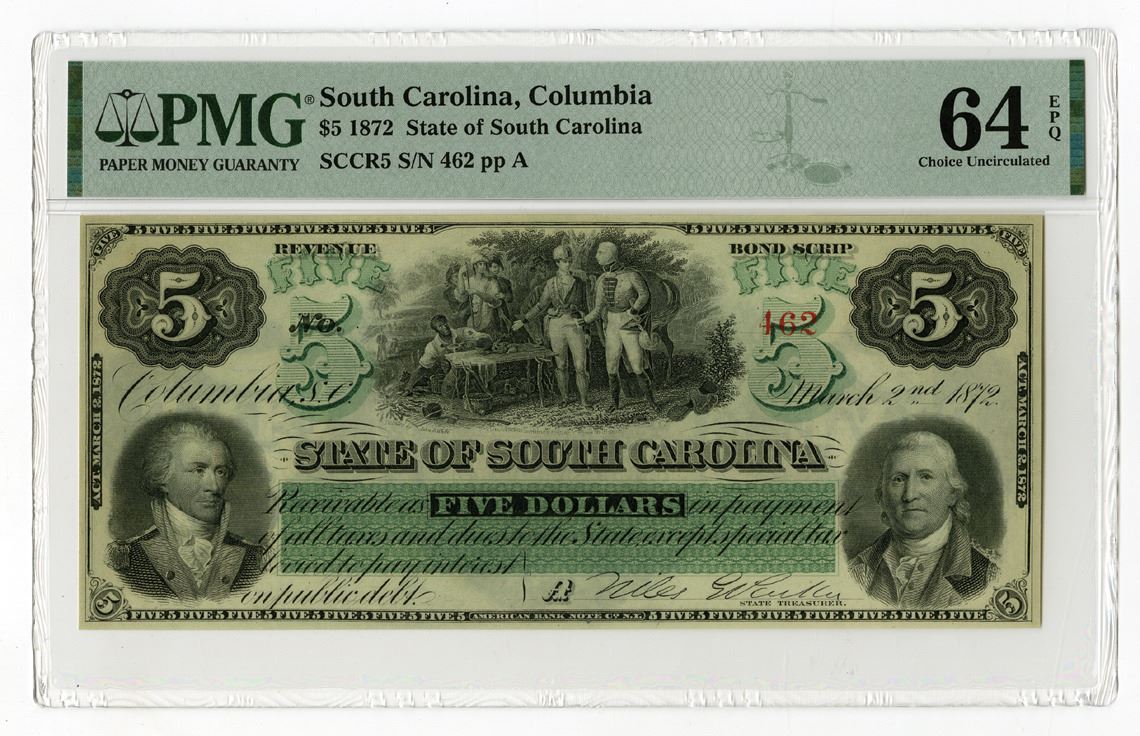 Columbia, South Carolina, 1872. $5, P-S3323 SCCR5, Issued Banknote, Black on green underprint, Portraits of Gen. T. Sumter at left and Gen. W. Moultrie at right with Gen. F. Marion's Sweet Potato Dinner at top center, Back is green with "5" at left and right and text at center, S/N 462 pp A, PMG graded Choice Uncirculated 64 EPQ, ABNC.