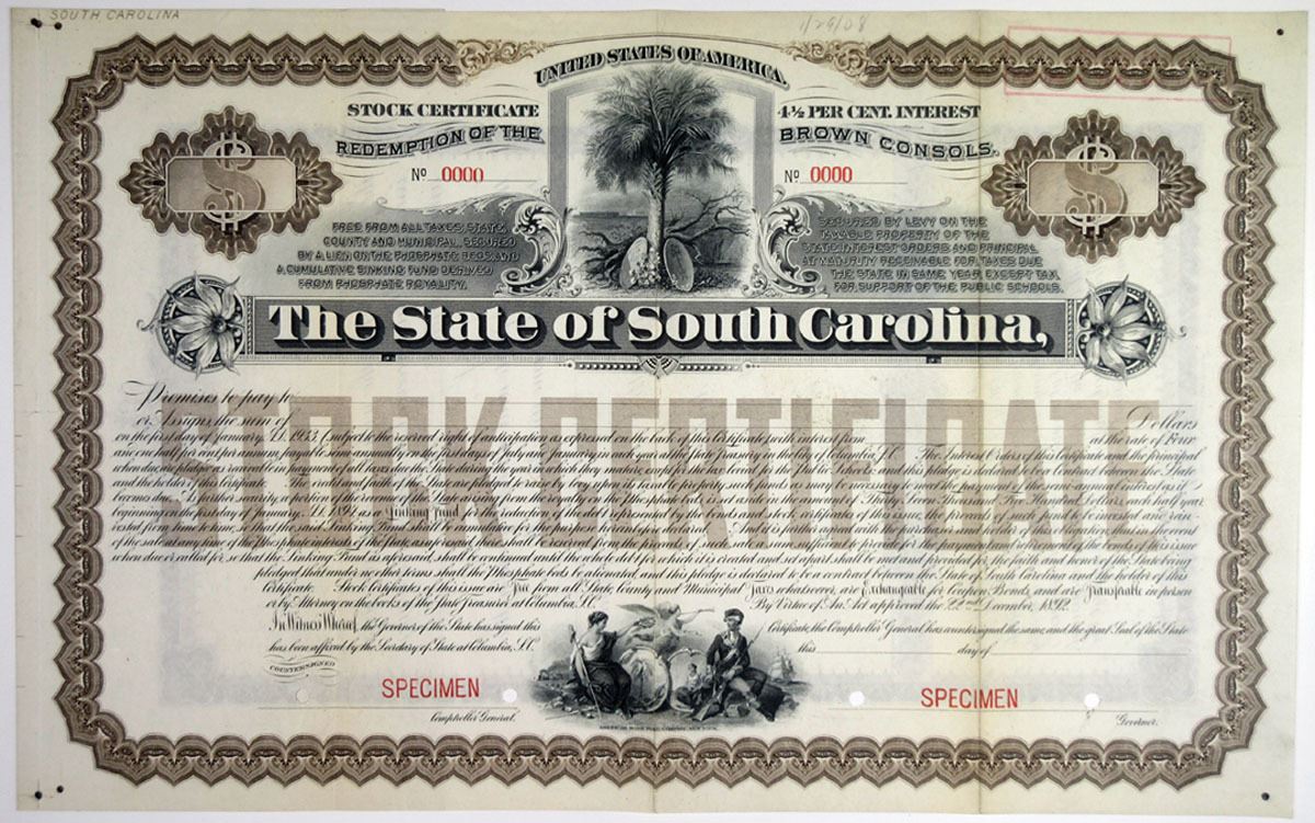 South Carolina, 1892. $Odd Specimen 4.5% Bond, Black text with brown border and underprint, South Carolina state seal depicted at top center. Red specimen overprints, 0000 serial numbers, and POCs. VF condition, ABNC.