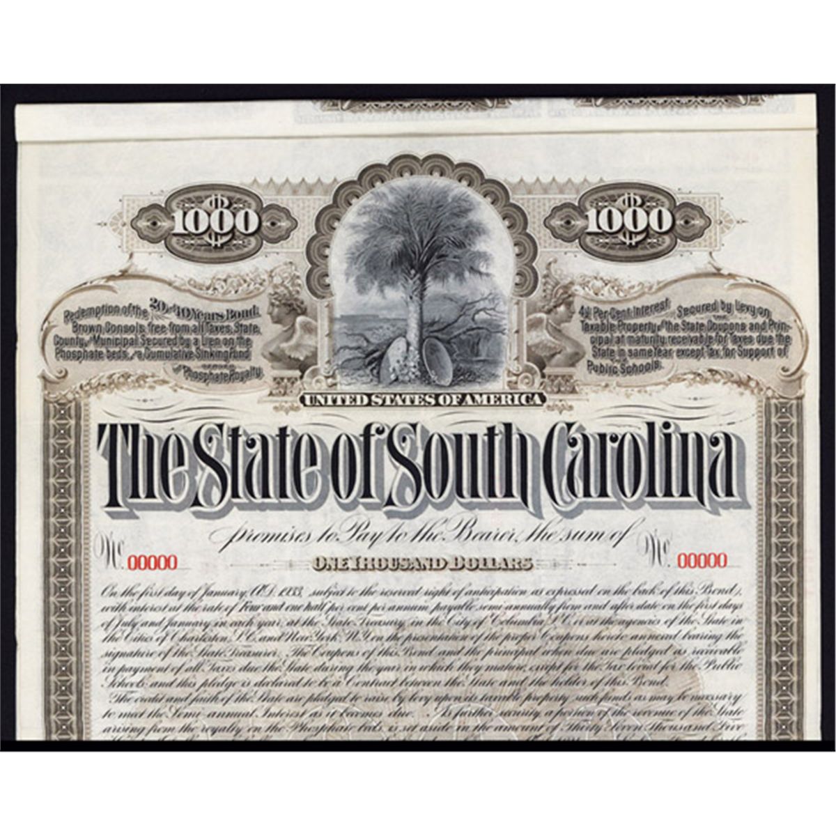 Columbia, South Carolina, 1892, $1000 bond, Specimen, Palm tree, Brown, ABNC, POC's, XF.