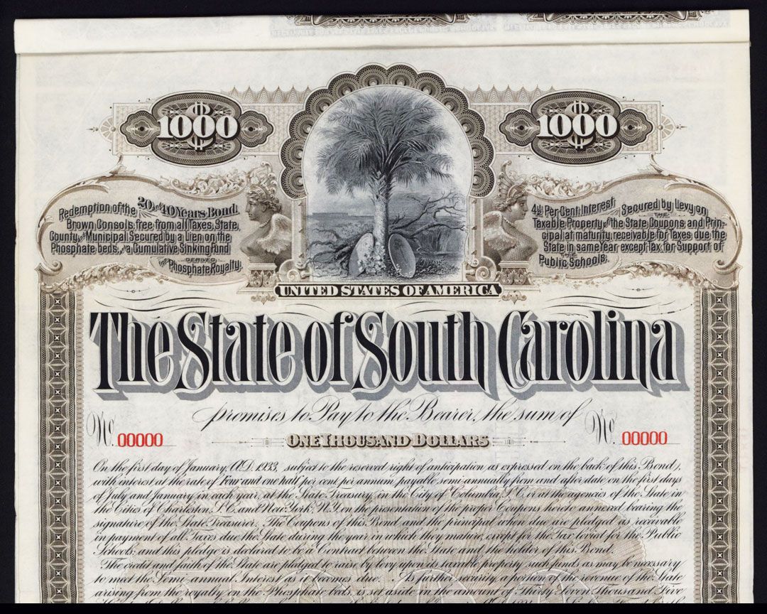 Columbia, South Carolina, 1892, $1000 bond, Specimen, Palm tree, Brown, ABNC, POC's, XF.