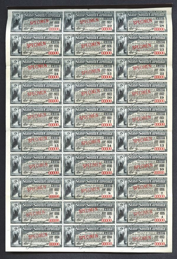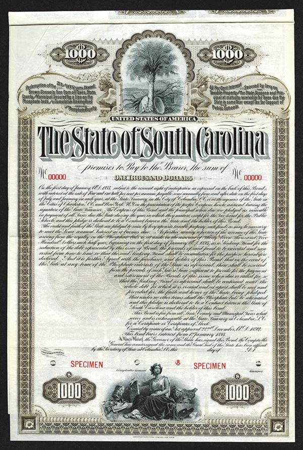 Columbia, South Carolina, 1892, $1000 bond, Specimen, Palm tree, Brown, ABNC, POC's, XF.