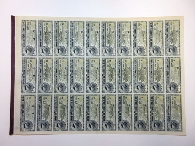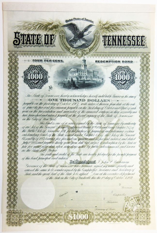 Tennessee, 1892, $1,000 Specimen 4% Redemption Coupon Bond, Black print on olive green border and under tint, Tennessee House of Representatives at top under company title, Punch out cancelled along bottom, VF-XF condition, ABNC.