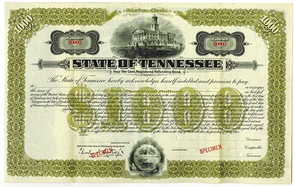 Nashville, TN. $1000 Specimen 4% Registered Refunding Bond, Black text with olive border and underprint, Tennessee State Capitol Building depicted at top center. Red specimen overprints, 00000 serial numbers, POCs. Fine condition, ABNC.