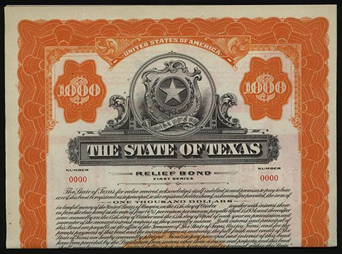 Texas, 1933, $1000, 4% Relief Specimen Bond, Black on orange border and underprint, Texas coat of arms top center, VF-XF condition, SBNC.