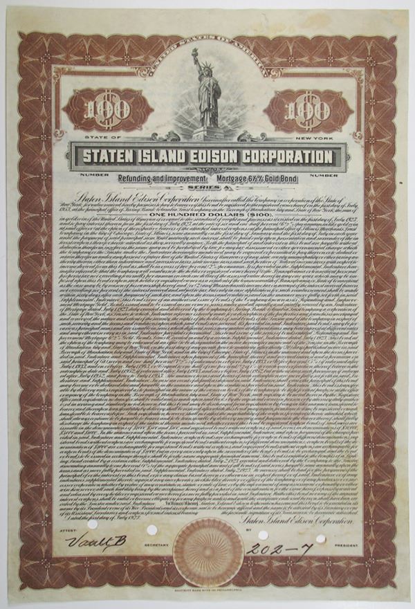 New York, 1923. $100 Specimen 6.5% Refunding and Improvement Mortgage Gold Bond, Black text with brown border and underprint, State of Liberty depicted at top center. Fine condition, POCs, some glue stains near margins. SBN. Rare and possibly unique.