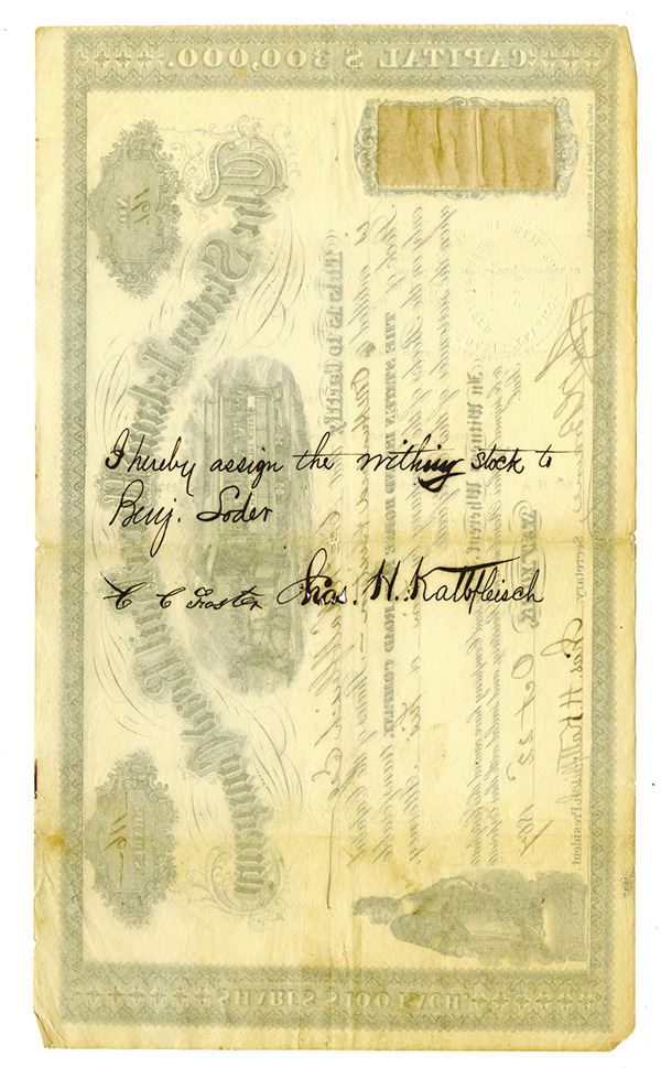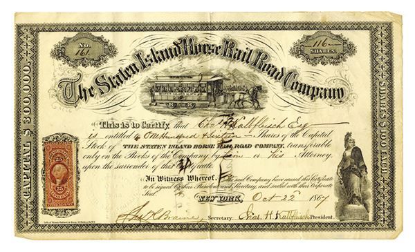 New York, 116 Shares, I/U, Black on off white paper, horse drawn street car in middle, Allegorical Liberty at lower right, revenue stamp on lower left, S/N 161, Issued to and signed by the president, Chas. H. Kalbfleisch, Esq., Fine condition with 6 small ink burn holes in middle of certificate. Listed railroad but unlisted as a stock certificate, only as a bond in Cox. One of 2 certificates found in an old estate from this rare railroad. Lith. of Henry Seibert & Bros.