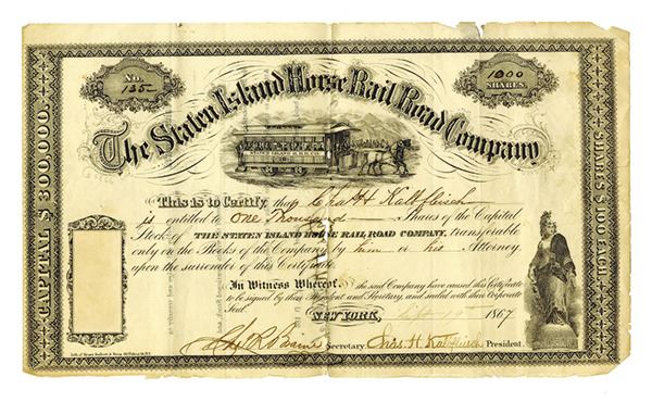 New York, 1000 Shares, Partially Issued, fully signed but no revenue stamp or seal on the lower left, Black on off white paper, horse drawn street car in middle, Allegorical Liberty at lower right, S/N 135, Issued to and signed by the president, Chas. H. Kalbfleisch, Esq., VG condition with archivally reinforced splits in middle of certificate and ink burn. Listed railroad but unlisted as a stock certificate, only as a bond in Cox. the second of 2 certificates found in an old estate from this rare railroad. Lith. of Henry Seibert & Bros.