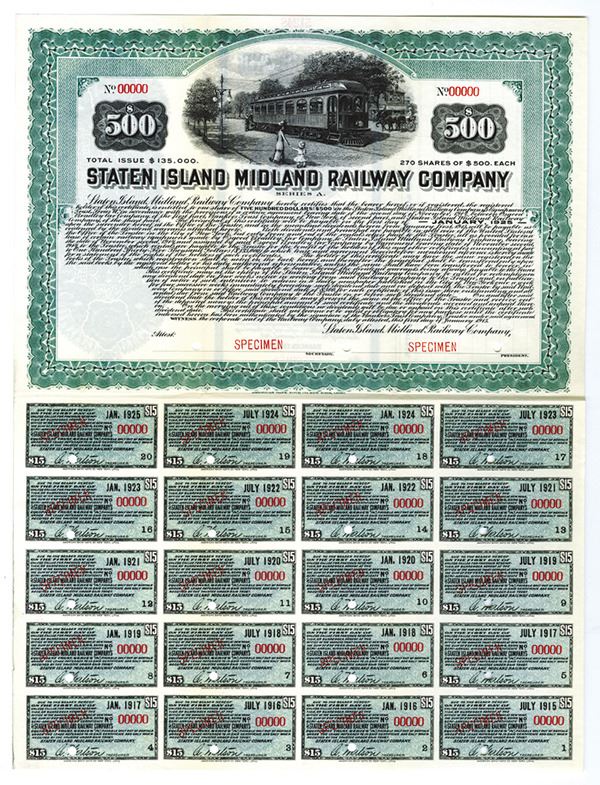 Staten Island, NY. Specimen bond. 1915. $500. Green border and undertint. Electric streetcar with woman and child watching it pass.. Red specimen overprints, POC's and "00000" serial numbers. Coupons attached. Unlisted railroad in Cox. Rare and attractive. ABNC.