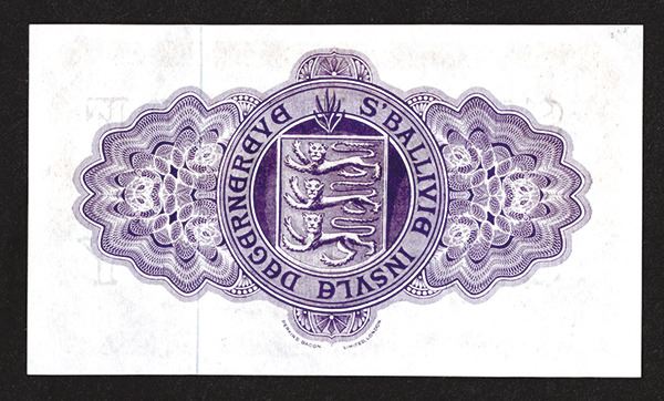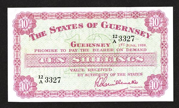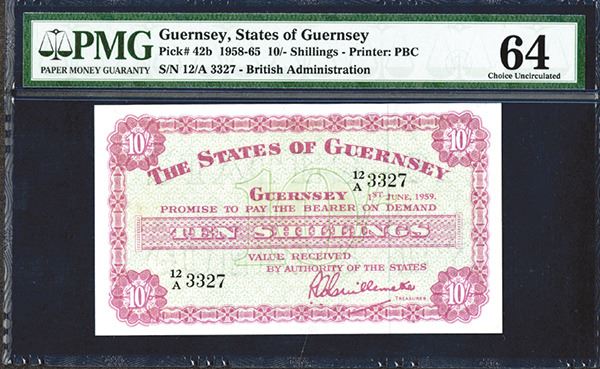Guernsey, 10/- Shillings, P-42b, Issued banknote, Lilac on light green , back purple, S/N 12/A 3327, small area of graffiti on the back top right corner, still PMG graded Choice Uncirculated 64. PB Ltd.