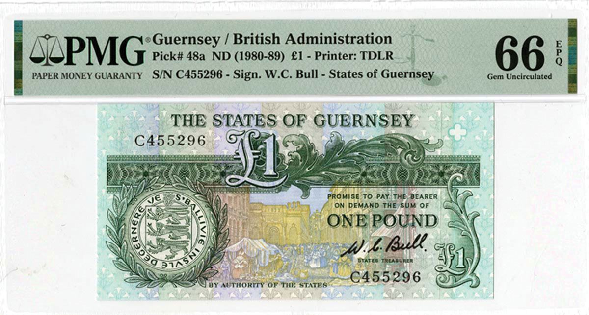 Guernsey, ND (1980-89). 1 Pound, P-48a, Issued Banknote, Dark green and black on m/c underprint with market square scene of 1822 at bottom, S/N C455296, PMG graded Gem Uncirculated 66 EPQ, TDLR.