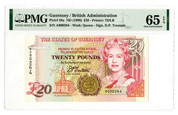 Guernsey. Issued £20 Pounds, ND (1996), P-58a, low serial A000264. Queen Elizabeth II at right, PMG graded Gem Uncirculated 65 EPQ (Cert # 1956597-027). TDLR.