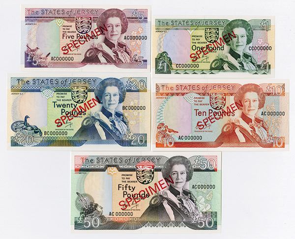 Jersey. Lot of 5 notes, Includes. £1, P-15s; £5, P-16s, £10, P-17s; £20, P-18s; £50, P-19s, All specimens with large red SPECIMEN overprint in middle, all with Queen Elizabeth II at right with different birds on the lower left corner areas all in different colors. The £5; £10 and £20 pound notes are in CU to Gem Uncirculated or better, the £1 and £50 notes are in Choice AU due to light internal bends. Attractive set.