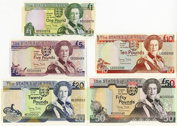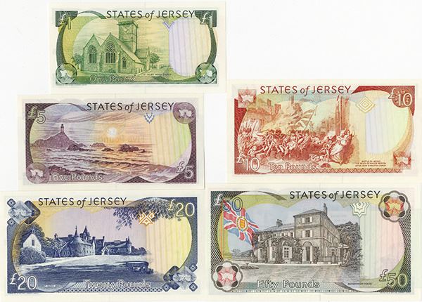 Jersey, Lot of 5 notes, All are from the 1993 ND Issue - Solid Value upper right. Includes £1; P-20a, 1st prefix, S/N GC 500078; £5, P-21a, 1st prefix with low serial numbers GC 000469; £10, P-22a, low serial numbers GC 000345; £20, P-23a, Low serial number GC 000012; and, £50, P-24a, Only prefix S/N AC 200043, all are Issued banknotes. All are Choice to Gem Uncirculated, Another attractive banknote assortment. (Arthur Matz Collection).