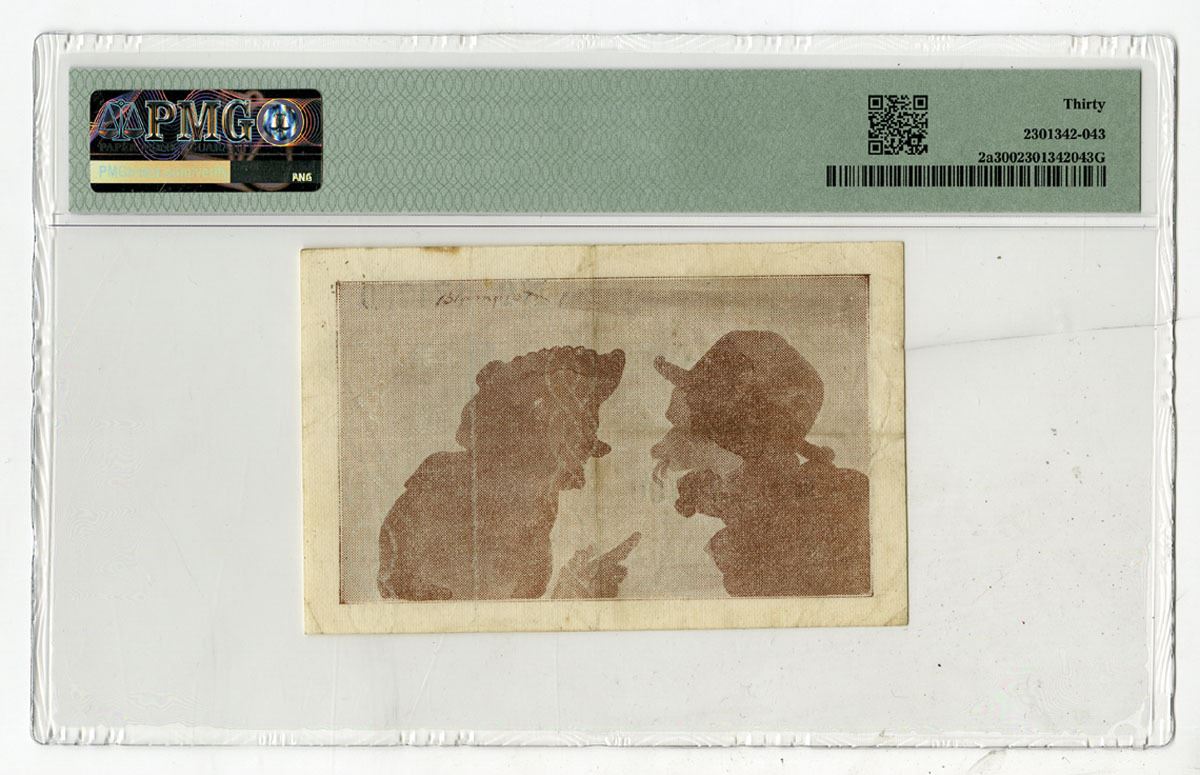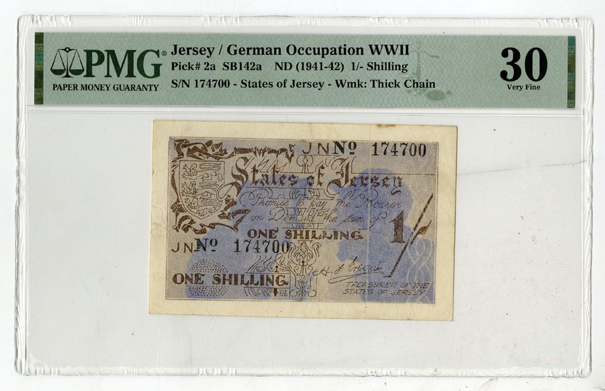 Jersey, ND (1941-42). 1/- Shilling, P-2a SB142a, Issued Banknote, Dark brown on blue underprint with arms at upper left and two men in underprint, Back is the same two men in brown, S/N 174700, PMG graded Very Fine 30.