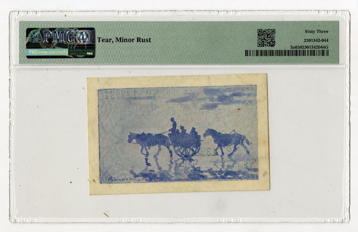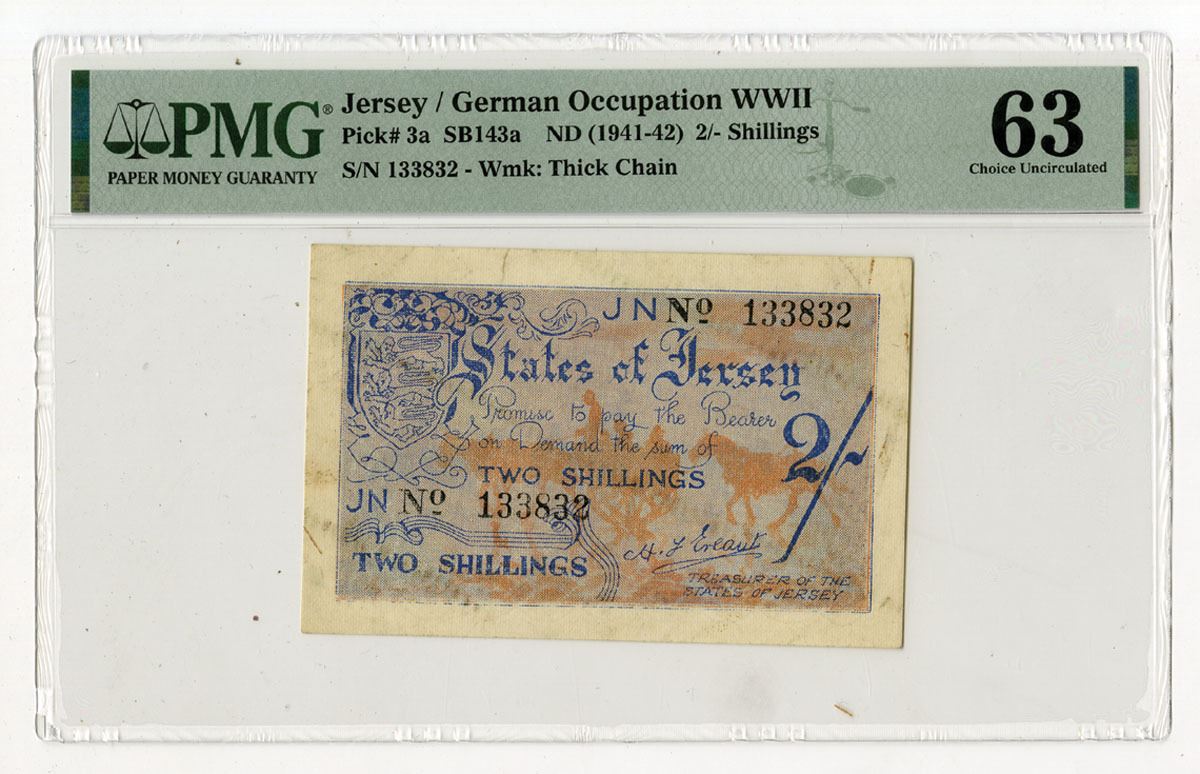 Jersey, ND (1941-42). 2/- Shillings, P-3a SB143a, Issued Banknote, Blue on light brown underprint with arms at upper left and horse-drawn cart in underprint, Back is same cart in blue, S/N 133832, PMG graded Choice Uncirculated 63 with comments "Tear, Minor Rust."