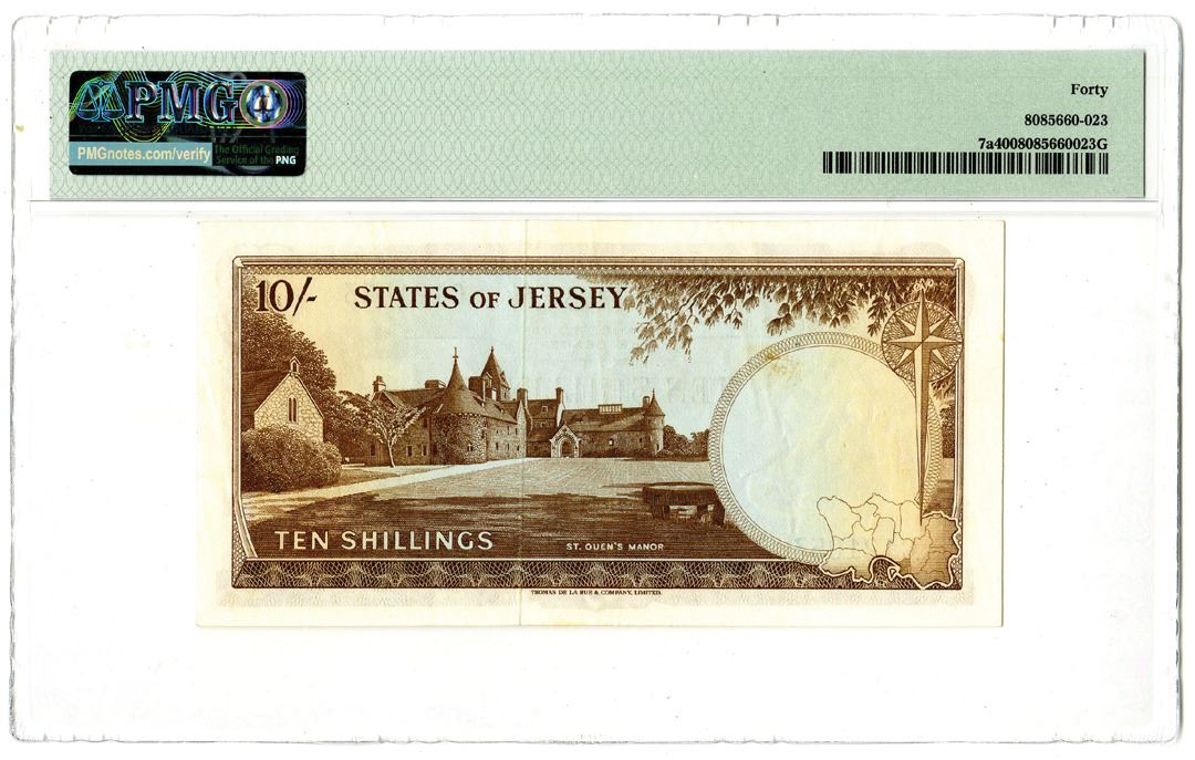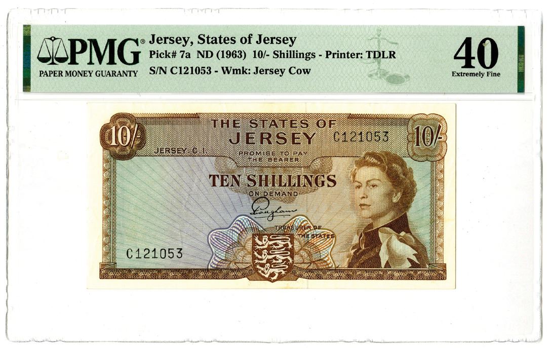 Jersey. ND (1963). 10/- Shillings, P-7a, Issued banknote, Brown on face, S/N C121053, Watermark: Jersey Cow, PMG graded Extremely Fine 40. Printer: TDLR.