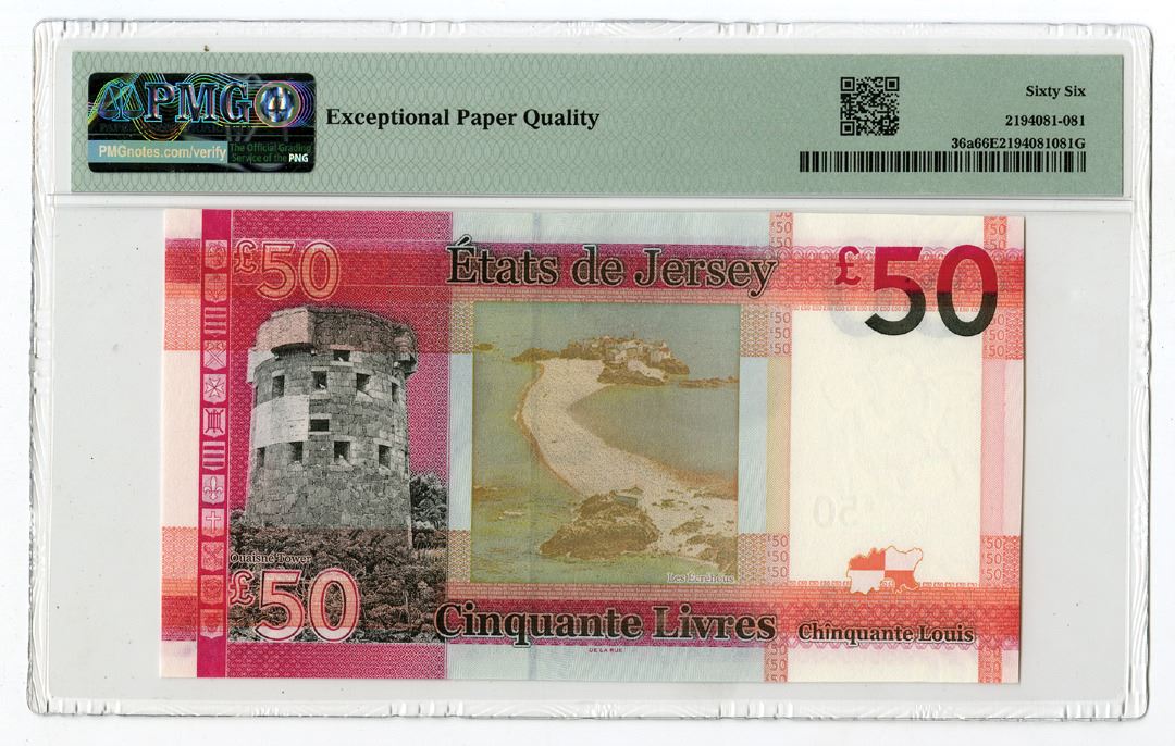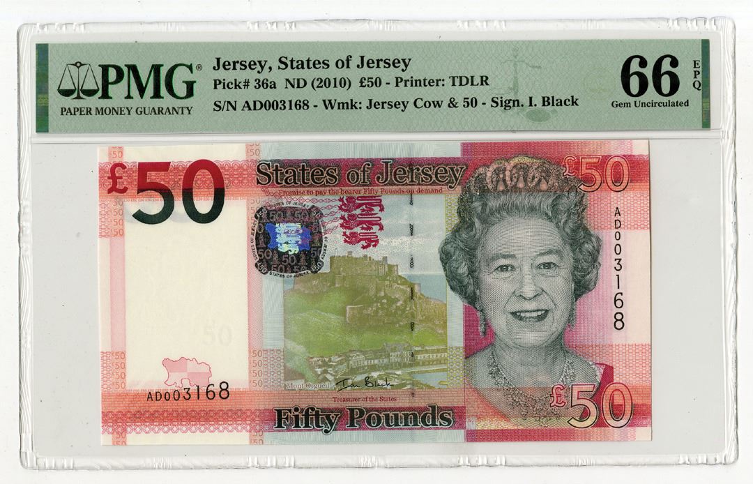 Jersey, ND (2010). 50 Pounds, P-36a, Issued Banknote, Black on red and m/c underprint, Portrait of Queen Elizabeth II at right and Mont Orgueil at center, Back is red on m/c with Ouaisne Tower at left and Les Ecrehous at center, S/N AD003168, PMG graded Gem Uncirculated 66 EPQ, TDLR.