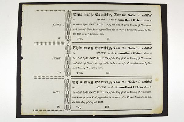 NY. Unissued sheet of 3 share receipts for the re-building of the steamboat by Henry Burden in Troy NY. Light foxing. EF+