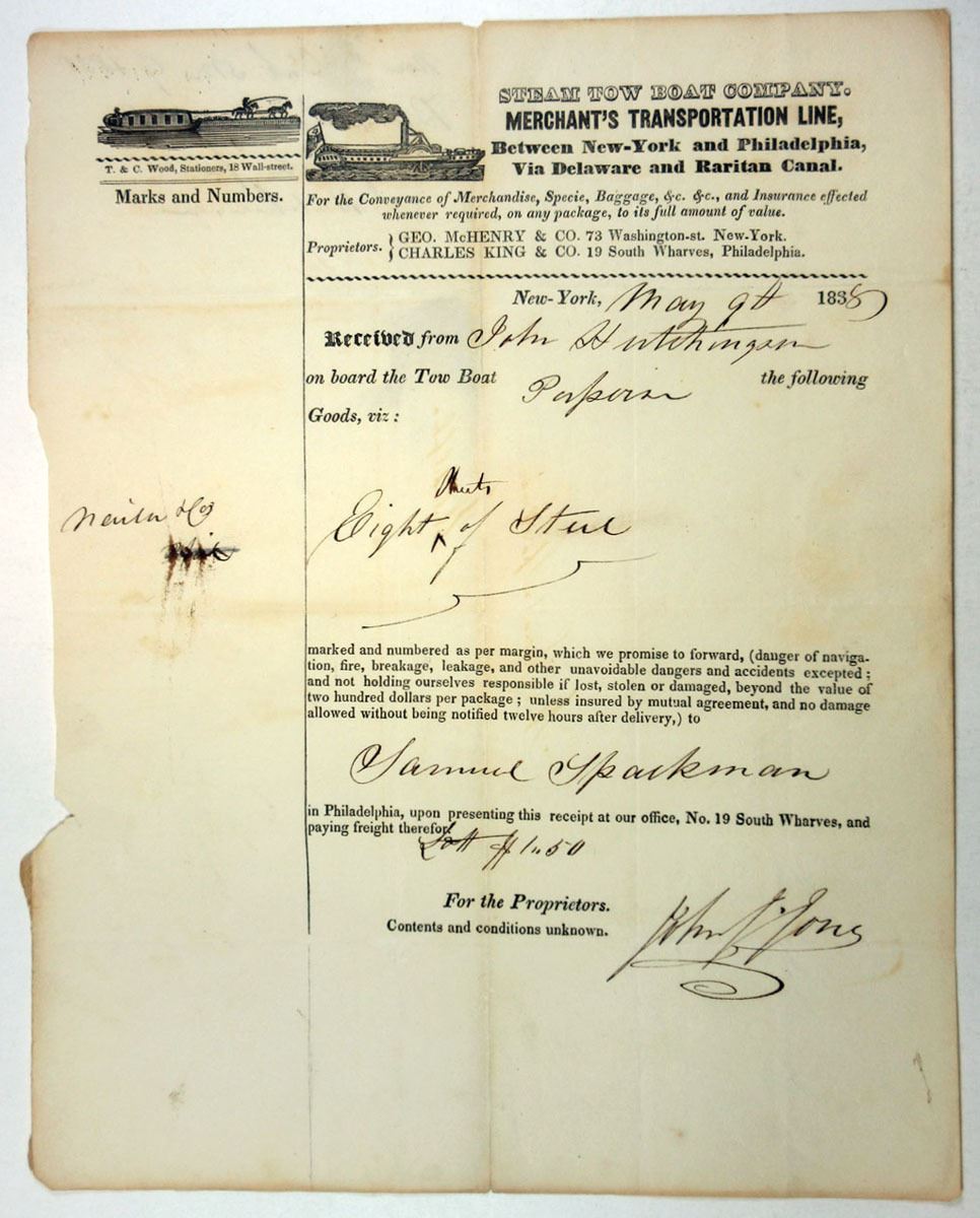 Steam Tow Boat Co. Merchant's Transportation Line 1838 Receipt/Letter VF. Steam Tow Boat Company. Merchant's Transportation Line, Between New-York and Philadelphia, via Delaware and Raritan Canal.