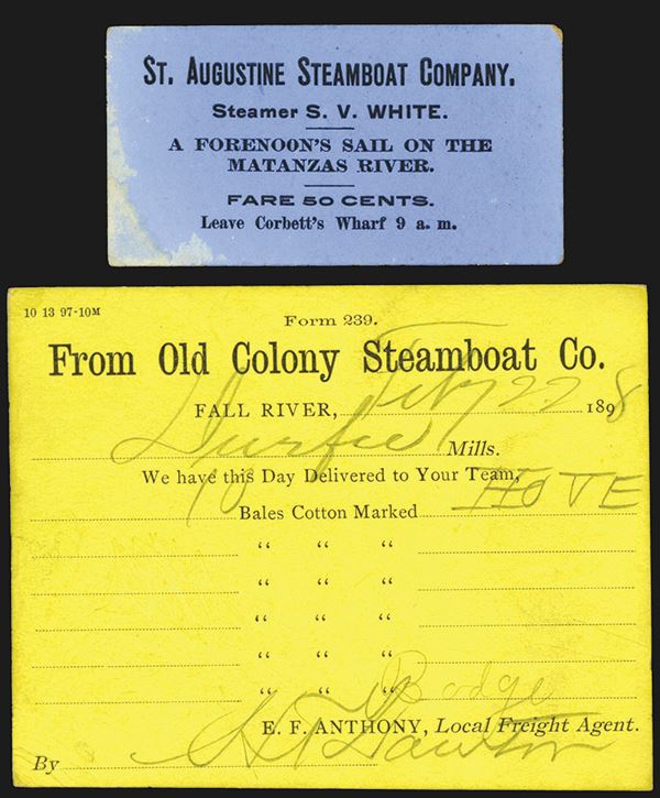 Old Colony Steamboat Co. Cotton Bales receipt, 1898; St. Augustine Steamboat Co. 50c Fare. 2 pieces.