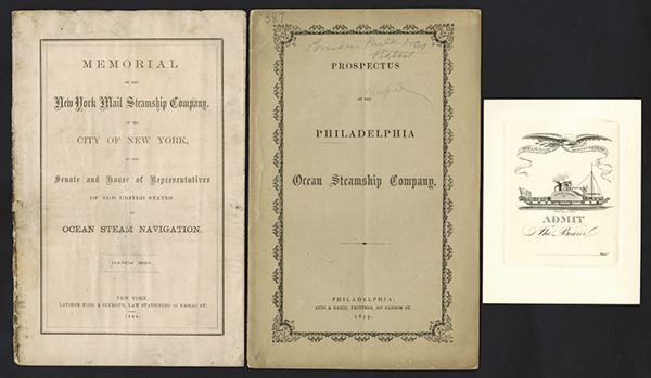 New York, Pennsylvania and Massachusetts. Lot of 3 items, Includes ca. 1830-40's proof Steamboat "Massachusetts" ticket printed on thin card with eagle and steamboat, Unc.; an 1859 Prospectus of the Philadelphia Ocean Steamship Co. pamphlet, VF; and Memorial of the New York Mail Steamship of the City of New York to the Senate and House of Representative of the United States, includes map of the routes of the New York Mail Steamship to Europe and South America, Fine but water damage. All are rare. (From the collection of John E. Herzog).