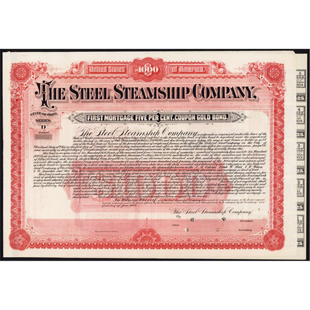 Ohio, 1902, $1000 bond, Series D, Specimen, Red, Series D, POC's, XF. One of 2 found, both different colors.