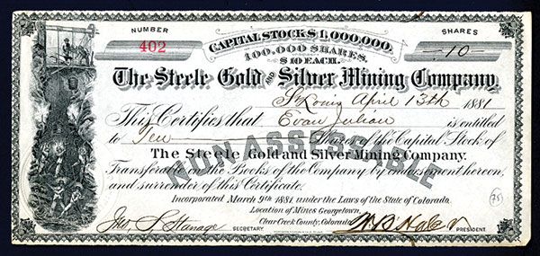 Colorado, 10 Shares, Issued and uncancelled stock certificate, Mining scene on left, Mines located in Georgetown, Clear Creek County, Colorado, VF condition. Scarce and attractive Mine.