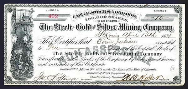 Colorado, 10 Shares, Issued and uncancelled stock certificate, Mining scene on left, Mines located in Georgetown, Clear Creek County, Colorado, VF condition. Scarce and attractive Mine.