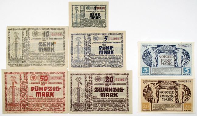 Germany. 1918, Lot includes 7 notes from Steinburg a quintet of 1, 5, 10, 20, and 50 Mark Notgeld; and from Wolfstein a pair of 5 and 20 Mark Notgeld. VF to XF. (7)